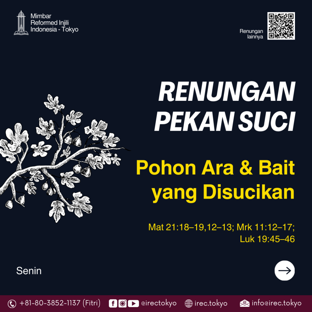 Hari ini kita diajak memeriksa: apakah hidup kita menghasilkan buah yang menyenangkan Tuhan? Atau kita sibuk menyusun daun-daun penampilan tanpa akar ketaatan? Apakah rumah Tuhan—baik secara pribadi dalam hidup, maupun secara bersama dalam jemaat—masih menjadi tempat doa dan ibadah sejati? Biarlah Yesus membersihkan hidup kita—bukan dengan murka yang membinasakan, tapi karena kasih-Nya yang tidak membiarkan kita tinggal dalam kekotoran, melainkan menuntun kita kembali kepada kekudusan dan penyembahan yang sejati.