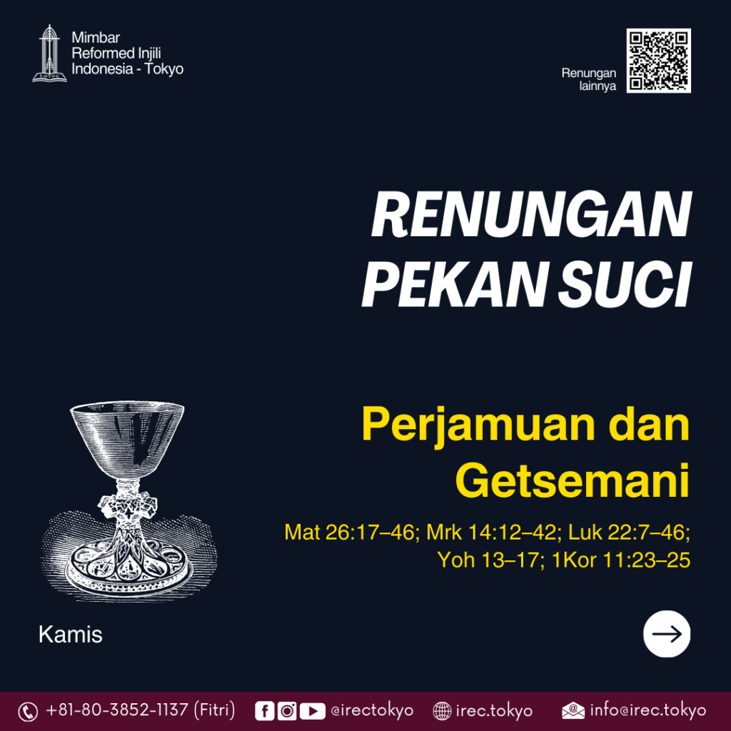 Yesus merayakan Paskah bersama murid-murid-Nya. Di tengah perjamuan, Ia mengambil roti dan berkata, “Inilah tubuh-Ku,” lalu cawan dan berkata, “Inilah darah-Ku.” Ia menetapkan perjamuan kudus bukan sebagai upacara simbolik belaka, melainkan sebagai sarana kasih karunia di mana Dia sendiri hadir secara nyata, meskipun tidak secara jasmani. Dalam roti dan anggur itu, umat percaya sungguh-sungguh dipersatukan dengan Kristus melalui iman. Kita tidak hanya mengenang, tapi sungguh dipelihara dan dikuatkan oleh Dia yang hidup.